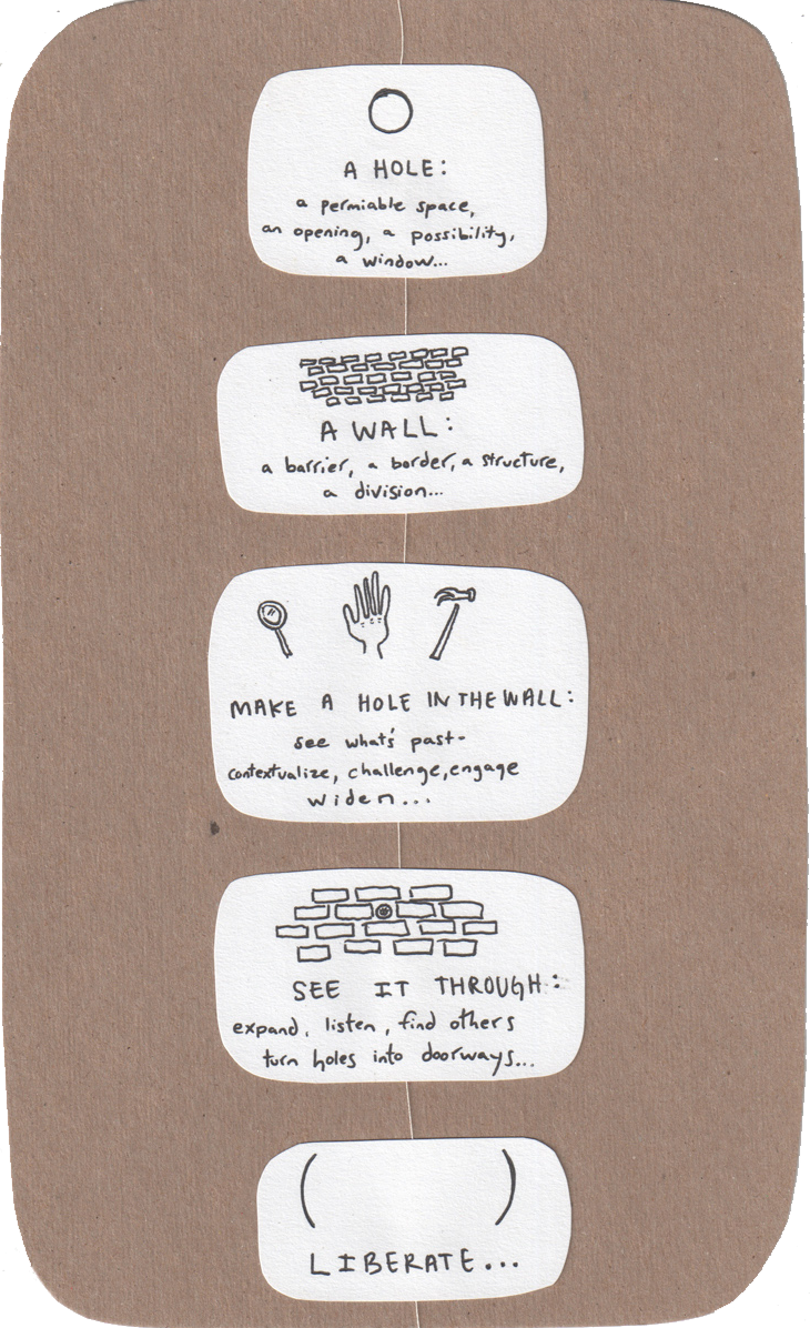 HOLES IN THE WALL COLLECTIVE works to hold SPACE most conducive to Creative Research, Reflection & Action. Space that can hold creative work across disciplines. Space for individual incubation and collective cross-over. As a curatorial organization, we design our programming to be THEMATIC, based on the current global temperature – a most pressing area that needs our collective attention and creative re-imagining.